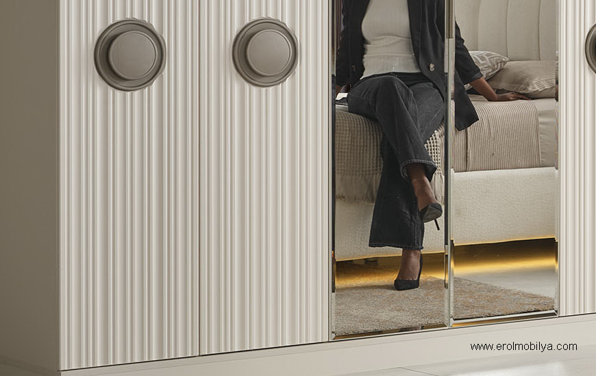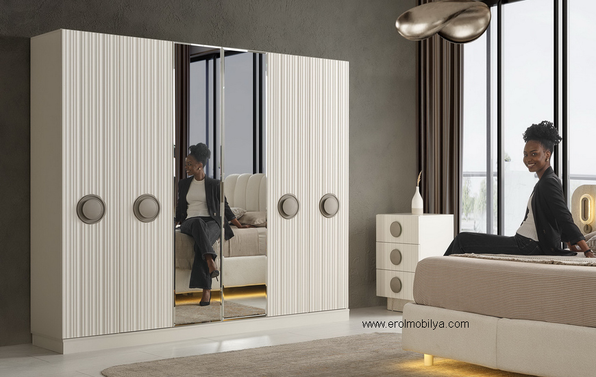 Ürüne Ait Parça Adetleri : 6 Kapılı Dolap, Şifonyer + Aynası, 2 Adet Komodin, Başlık , Çamaşırlık Bu Üründe Başlığa Uygun Baza ve Yatak Ölçüsü : 150 cm * 200 cm veya 160 cm * 200 cm dir(Yaylı Yatak ve Baza Fiyata Dahil Değildir) * TSE |